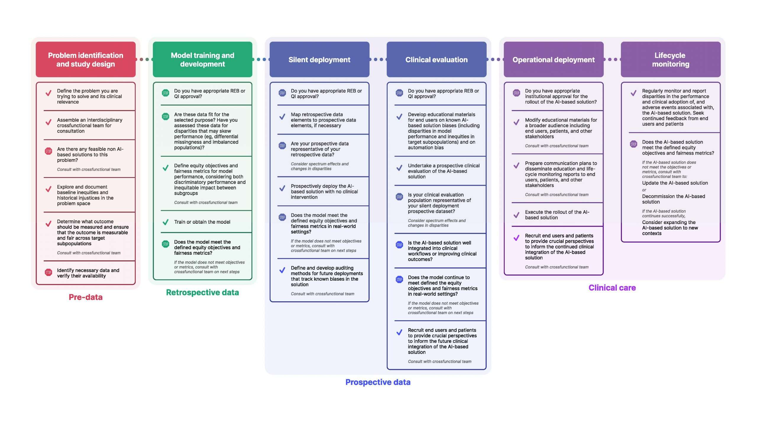 The cross-functional team composition and involvement of specific individuals should depend on the scope, topic and the current stage of the project. The team is not a formal review committee, but one that ensures each stage of development is considered by an appropriate expert. Over the lifetime of the project, the team should, at some point, include ML researchers, clinicians, data analysts, statisticians, equity and ethics experts, patient representatives, clinical champions and end-users, as well as ethics, privacy and strategy representatives.